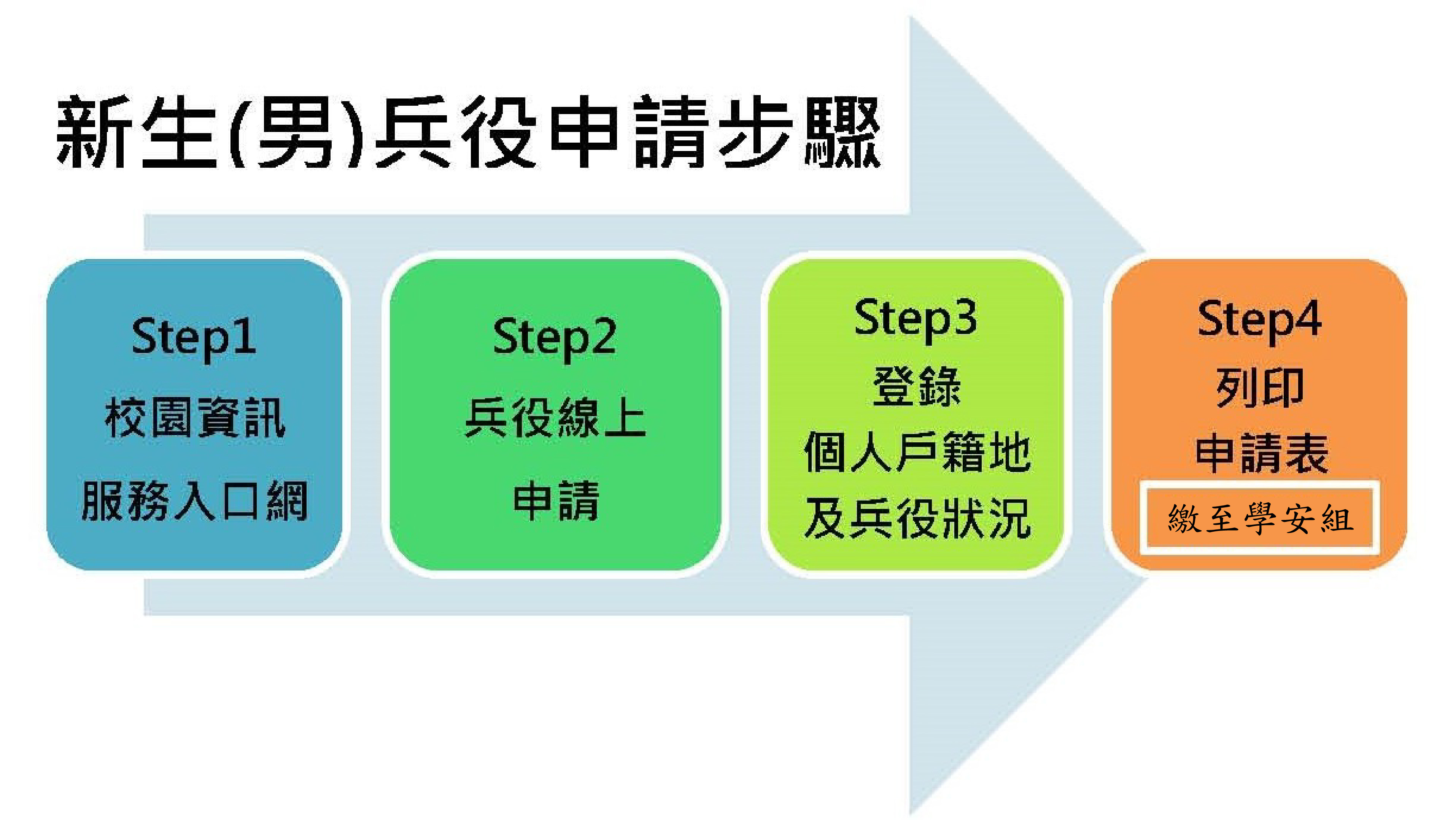 一、新生未服役之男同學,請至兵役資料申請系統「學生兵役緩徵申請表」填妥並貼上身分證正、反面影本,繳交至學生安全組辦理。